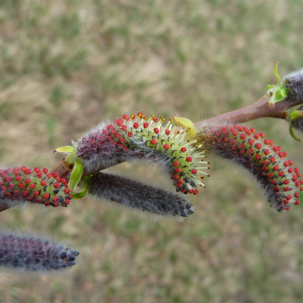 Blüte: März-April in Kätzchen, zweihäusig, männliche Kätzchen erst purpurn dann gelb