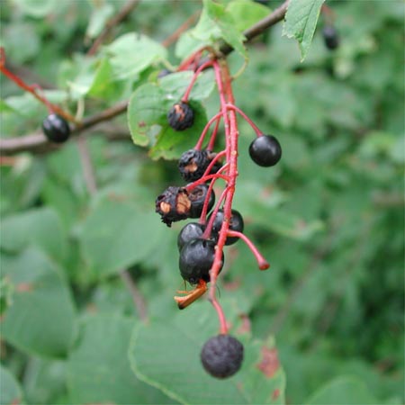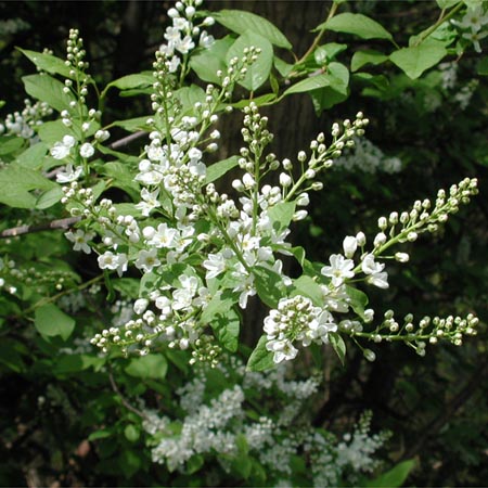Zart wirkender Baum oder Strauch mit süß duftenden Blütentrauben im April, sehr frühem Blattaustrieb und vielen kleinen schwarzen, ungenießbaren Kirschlein. Für sonnige und halbschattige Hecken. Traubenkirsche wächst schnell und treibt nach Rückschnitt stark aus.